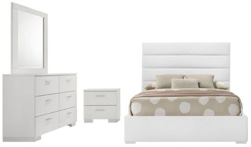 Upgrade your bedroom with this ultra-modern platform bed and matching case pieces. The bed features a sleek white faux leather upholstery with horizontal channel tufting, while its low-profile design enhances the contemporary aesthetic. Case pieces are finished in a polished white high-gloss polyurethane for a clean, sophisticated look.Read More