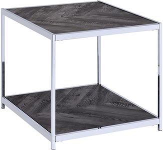 This transitional style end table is no ordinary end table. It has a distressed, charcoal finish on both the top and shelf. It has a chrome metal base and an open bottom shelf. There is a herringbone design on the top and the shelf.