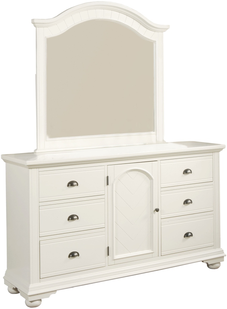 The Brookpine 6-Drawer Dresser and Mirror Set is the perfect addition to your bedroom! This horizontal dresser comes with six, spacious drawers and one spacious cabinet. Inside the cabinet are two adjustable shelves, allowing you to customize your storage space. The bottom drawers feature a dust proofing layer to help protect your belongings. Dark metal hardware complete the drawer fronts. The arched portrait mirror complements the dresser perfectly. Bevel edges and bun feet complete the look of this stylish duo.