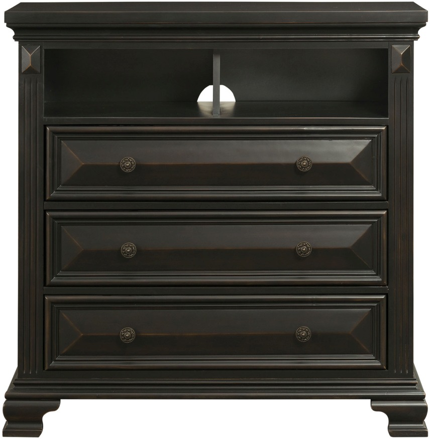 The Calloway Media Chest is a great addition to your home! This chest comes with three spacious drawers, making it easy to store away any belongings neatly. Two media compartments help keep devices properly in place, while the chord control cutout in the back keeps wires out of sight. The drawer fronts feature a raised panel design, adding extra flair to this already stylish piece. The dark metal finish knobs pair beautifully with the antique black finish. Bevel edges and bracket feet complete the look of this media chest.