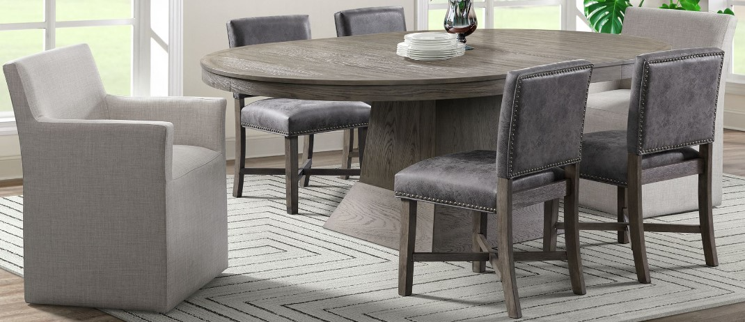 Solidly crafted of rubberwood and MDF, the Collins flaunts a unique round table top with a chunky pedestal base. Finished in a gray with wood grain detailing throughout. Extend your welcome with the 2 12" inch leaves creating more space for up to eight guests. The side chairs are upholstered in faux leather adding texture to the dining set. Adding an element of sophistication and comfort, the arm chairs are wrapped in a slipcover. The "can-go-with-anything" finish and flexible seating design makes this dining set perfect for your dining room or breakfast nook space.