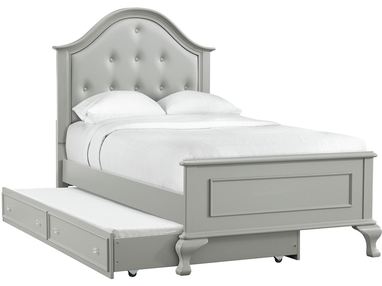 The Jesse Twin Panel Bed with Trundle guarantees sweet dreams for your little one. This delicate design features a faux leather headboard adorned with chic white buttons. Crafted of durable solid and manufactured wood, finished in beautiful grey. The trundle is accented by the crystal like knobs that give easy access to rolling it out.Read More