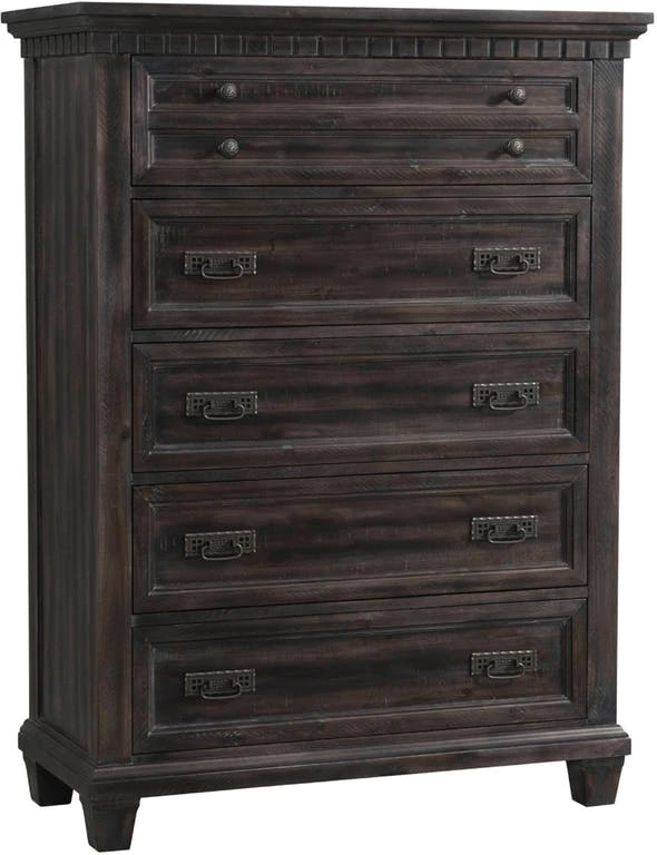Discover refined craftsmanship with the Morrison chest. Made with solid Acacia wood, this dresser features a rich smokey gray oak lacquer finish, smooth ball bearing drawer glides, and oil-rubbed bronze hardware. Enjoy premium touches like felt-lined drawers and dust-proof construction—where durability meets timeless style.Read More