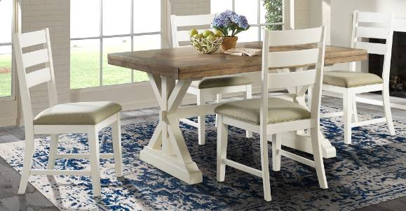 The trestle base and the cool, unique table top will instantly give your home that perfect farmhouse style you crave. The chairs feature a ladder back design with an upholstered seat in a transitional taupe fabric. Add this set to your home today!