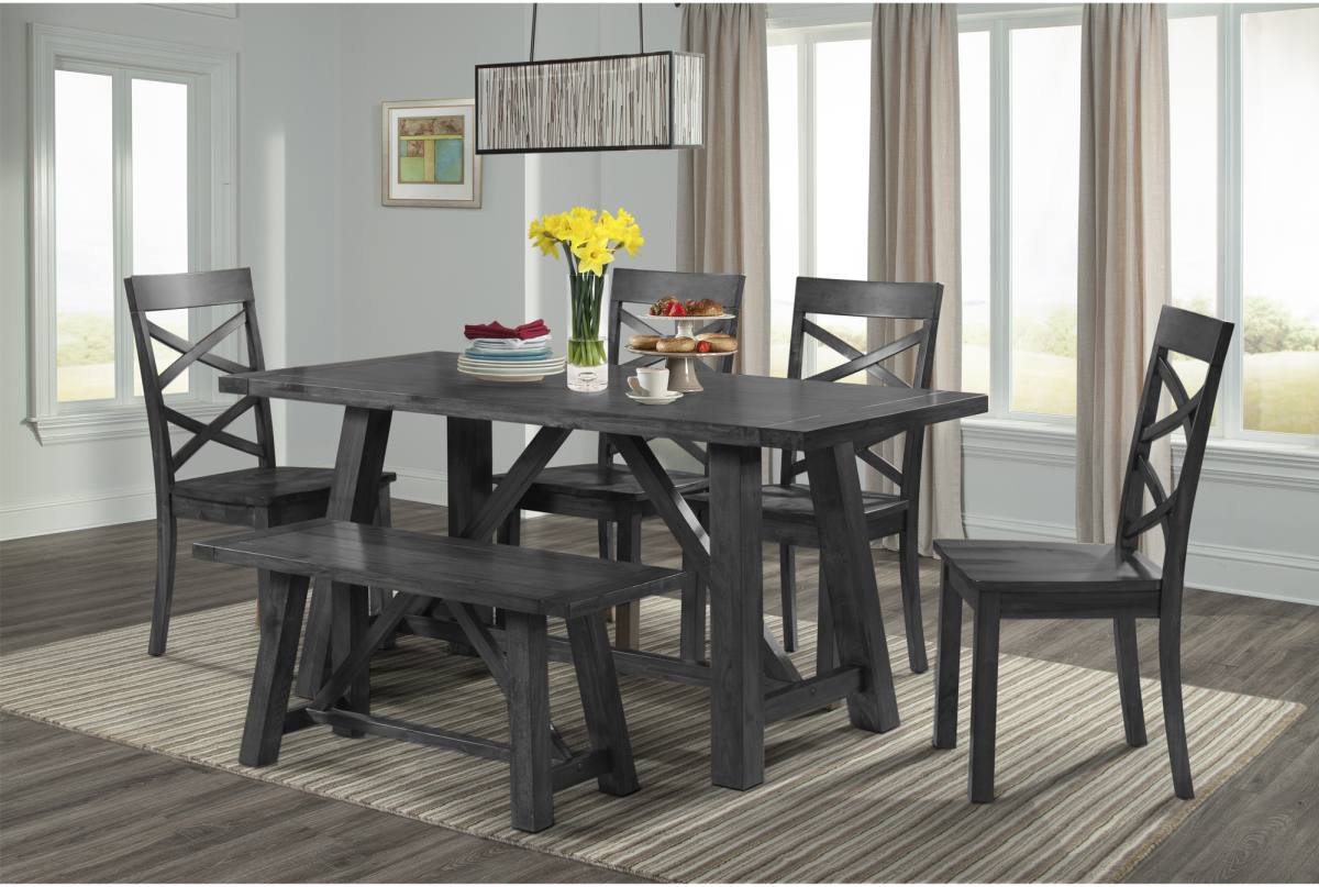 The Renegade 6PC Dining Set will be a standout in any kitchen. This rustic farmhouse set includes a table, four side chairs, and bench. The table base features trestle style legs with stretcher. Elevating this set, the side chairs are designed with an intricate cross back design. Perfectly mirroring the table, the bench and can seat two people comfortably as well. The grey finish of the complete set can effortlessly fit in with any other decor in your home. The best part of this set is that it ships in one box for ultimate convenience!