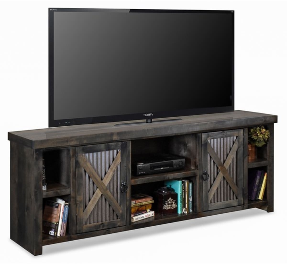 Necessity met simplicity and they hit it off beautifully in this charming, casual rustic group. Lightly patinaed corrugated metal door panels set inside a solid Knotty Alder frame give Jackson Hole all the charm of its namesake.