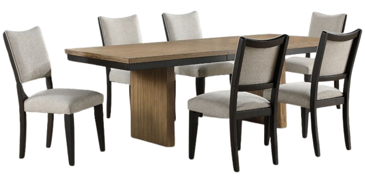 Sophisticated Aesthetics: The clean, streamlined look of the table and the timeless elegance of the wood-trimmed chair backs elevate your dining space’s style. The table features a reverse-matched diamond veneer top and a two-tone toffee and black finish, complemented by the wood-trimmed backs of the chairs